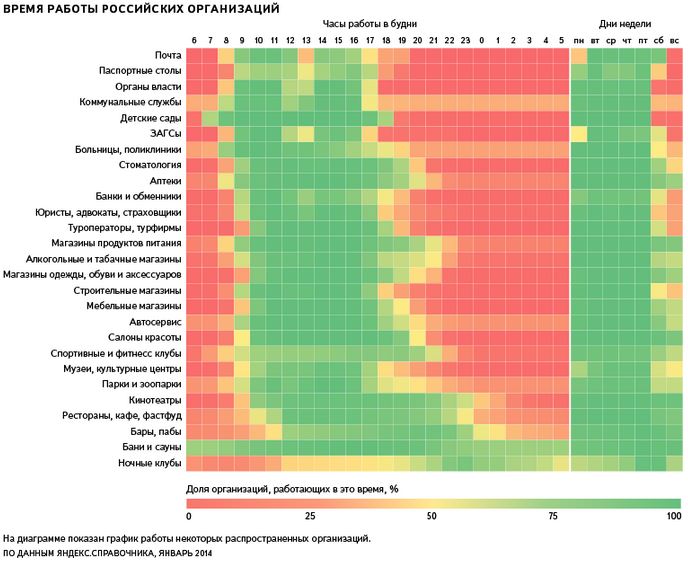 На продолжительность рабочего дня сильно влияет тип организации. Самый длинный рабочий день у заведений развлекательного характера (боулинг-клубы, кинотеатры, суши-бары), а самый короткий – у государственных и общественных организаций (например, станции переливания крови, паспортные и миграционные службы).