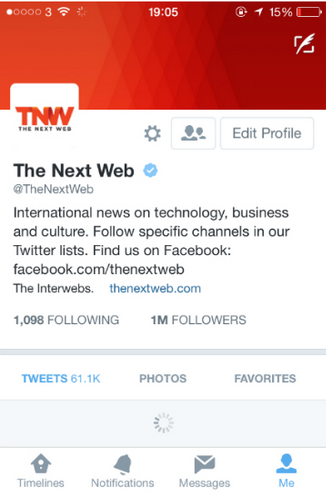 Так, в действующей мобильной версии при переходе на страницу профиля (в русской версии называется «Я», в английской – «Me») на экране отображается «шапка», в центре которой размещен аватар пользователя и его ник. Под «шапкой» - информация о количестве опубликованных твитов, читаемых пользователей и подписчиков. Информация о самом аккаунте (сайт и краткое описание) показывается на втором экране «шапки».