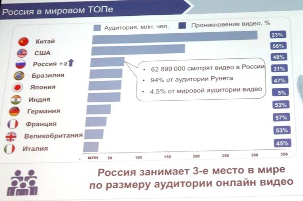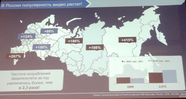 По данным сomScore и TNS, в Рунете просматривается около 15 млрд. видео за месяц; расширяются и территории просмотра онлайн-видео. Во многом это достигается за счёт роста широкополосного доступа в интернет в регионах. Частота потребления видеоконтента пользователями за год увеличилась в 2,5 раза.