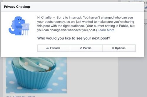 Facebook тестирует новый функционал оповещения о настройках приватности для пользователей веб-версии социальной сети. Всплывающее окно с изображением динозавра еще раз напомнит пользователю о том, кому будет виден его пост и предложит установить соответствующие настройки видимости для публикации.