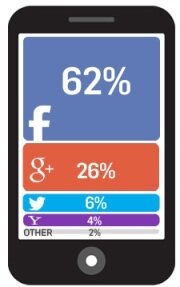 Похожая картина наблюдается и среди пользователей мобильных устройств, однако Twitter-аккаунты здесь популярнее учетных записей пользователей Yahoo. Лидерами остаются Facebook и Google+. Частота использования Google+ для авторизации на мобильных ресурсах во многом обусловлена высокой степенью интеграции популярных сегодня устройств на OS Android с сервисами Google.