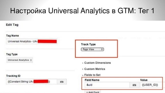 Настройка осуществляется следующим образом: если на сайте работает Google Tag Manager, то вводится код Universal Аnalytics, а затем создается правило.