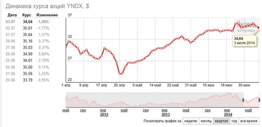 На сегодняшний день стоимость акций Яндекса на бирже Nasdaq составляет 34,64 долл. США за бумагу.
