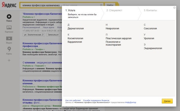 А задав запрос [клиника доктора калиниченко], пользователь может записаться на прием прямо на странице выдачи: