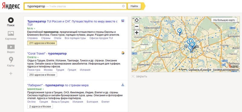 Так например, по запросу [туроператор] для некоторых ответов начал показываться дополнительный блок-контейнер с картой: