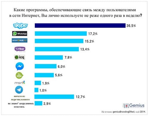 Исследование проводилось в мает 2014 года, всего было опрошено 1137 респондентов в возрасте от 18 до 74 лет. Результаты исследования показали, что Skype занимает лидирующую позицию на российском интернет-рынке.