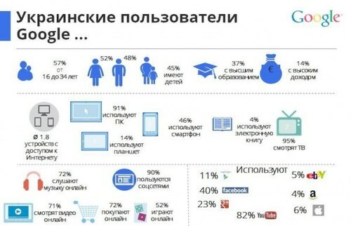 Исследование дало возможность нарисовать портрет украинского пользователя Google. Так 57% пользователей Google находится в возрастной категории от 16 до 34 лет; 45% имеют детей, 37% получили высшее образование. Они активно используют различные устройства - в среднем на одного украинца приходится 1,8 устройств с доступом к Интернету. Большинство украинских пользователей Google регулярно слушает музыку онлайн, смотрит видео контент (82% из них активно использует YouTube) и совершает покупки через Интернет.