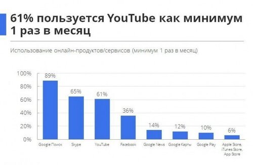 Поиском Google в личных целях по крайней мере один раз в месяц пользуется 89% украинцев, а видео на YouTube регулярно смотрит 61%.