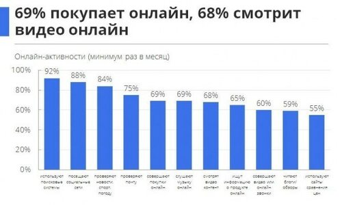 Данные исследования продемонстрировали растущую роль онлайн-покупок, просмотра видео и прослушивание музыки онлайн. Лидирует среди онлайн-активностей поиск информации через поисковые системы - 92%, общение в социальных сетях - 88%, чтение новостей - 84% и проверка электронной почты - 75%.