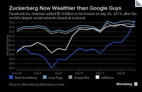 По итогам первого полугодия 2014 доходы основателя и CEO Facebook Марка Цукерберга (Mark Zuckerberg) превзошли доходы сооснователей Google Сергея Брина (Sergey Brin) и Ларри Пейджа (Larry Page). В очередном рейтинге миллиардеров Bloomberg Цукерберг занял 16-ю позицию, увеличив своё состояние на 1,6 млрд. долл. США - до 33,3 млрд. долларов.