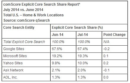 В июне доля Yahoo впервые опустилась ниже 10%. Тенденция к падению доли компании на рынке поиска США после некоторой стабилизации наметилась летом 2013 года. Именно тогда стало известно, что поисковая доля Bing выросла в июне до 17.9% за счёт доли Yahoo, которая упала до 11.4%, сообщает comScore. Это свидетельствовало о том, что поисковая сделка Yahoo-Microsoft не работает на пользу первой.