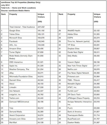 Агентство аналитики comScore опубликовало очередной ежемесячный рейтинг популярности веб-сайтов США. В топ-5 вошли Google, Yahoo, Microsoft, Facebook и AOL. За ними следуют Amazon, Turner Digital, MODE Media (бывшая Glam Media), CBS и Apple.
