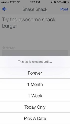 Когда пользователь начинает печатать подсказку в Foursquare, в нижнем левом углу появляются часы со словом "Forever". Нажимая на часы, можно выбрать период актуальности совета в виде определенной даты или временного отрезка.