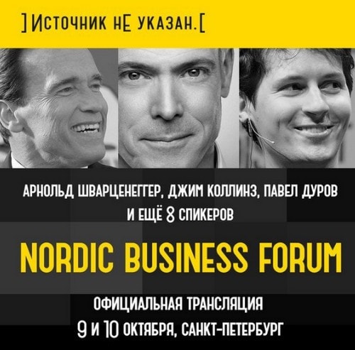 9 и 10 октября в Зоне действия на Лиговском, пройдёт прямая онлайн-трансляция крупнейшего образовательного делового события Nordic Business Forum, на котором выступит Павел Дуров и еще восемь звезд Forbes и TED (среди них один из самых талантливых ораторов планеты Кен Робинсон со 150 миллионами просмотров лекций) и кандидат на Нобелевскую премию по экономике и Арнольд Шварценеггер.