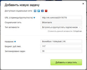 При открытии вкладки «Социальные факторы» и нажатии на ссылку «Новая задача», откроется окошко настройки задачи, где в специальное поле нужно вставить url-адрес страницы или группы, на которой необходимо произвести те или действия. В поле «Тип активности» можно выбрать одну из предложенных задач, затем скорректировать бюджет и число выполненных задач: