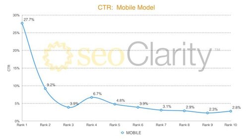 Компания seoClarity опубликовала новое исследование ранжирования кликабельности в мобильном поиске. Исследование показало, что, если сайт не занимает первое место в мобильных результатах поисковой выдачи, кликабельность значительно падает, при этом номер в выдаче почти не имеет значения.