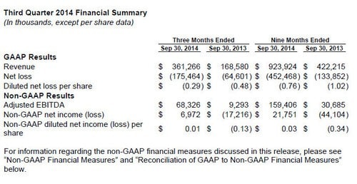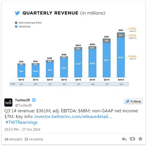Сервис микроблоггинга Twitter выпустил финансовый отчет за третий квартал 2014 года, согласно которому доход компании вырос на 114% по сравнению с аналогичным периодом прошлого года и составил 361 млн. долл. Компания также сообщила о чистом убытке в размере 175 млн. долл. Чистая прибыль non-GAAP составила 7 млн. долл., прибыль на акцию по GAAP - 0,29 долл., non-GAAP - 0,01 долл.