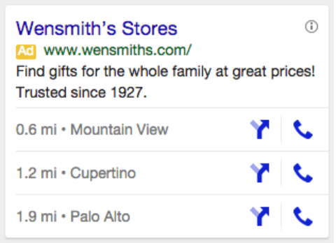 Обновление предлагает потребителям возможность выбора мест посещения непосредственно в объявлении. Объявление может показать как улицы для каждого из мест, так и города, и близость к потребителю в зависимости от настроек местоположения. Как обычно, объявления с адресами включают ссылки для прокладки маршрута и возможности позвонить.