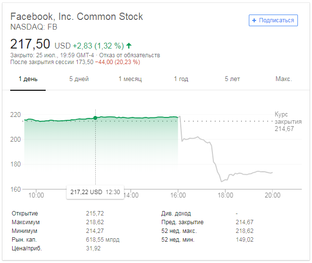 Facebook представил финансовые результаты за второй квартал 2018 года. В результате скандалов с утечками данных и фейковыми новостями выручка компании не оправдала ожиданий рынка. После публикации отчёта стоимость акций Facebook на послебиржевых торгах упала на 20%, а рыночная капитализация снизилась более чем на $123 млрд.