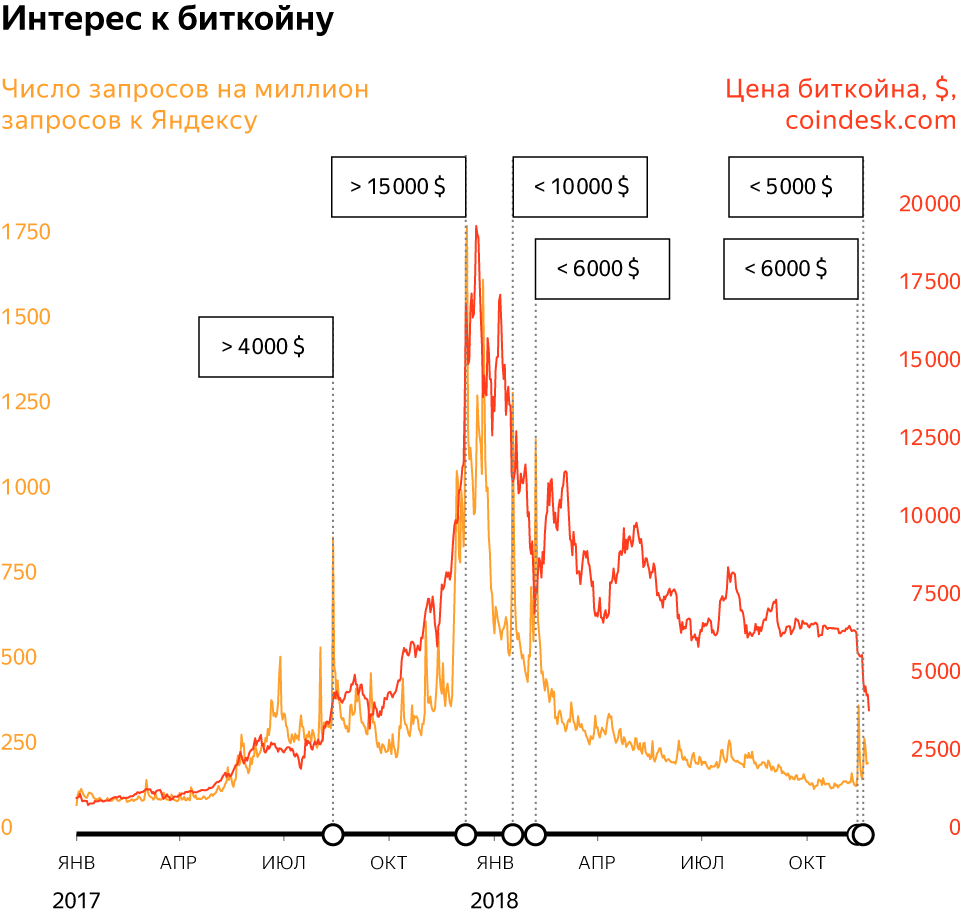 Своего пика интерес к биткоину достиг в декабре 2017 года, когда цена криптовалюты достигла максимального уровня в $20 000. В этот период на тысячу запросов к Яндексу минимум 2 были связаны с биткоином, а про его курс пользователи спрашивали даже чаще, чем про курс доллара США.
