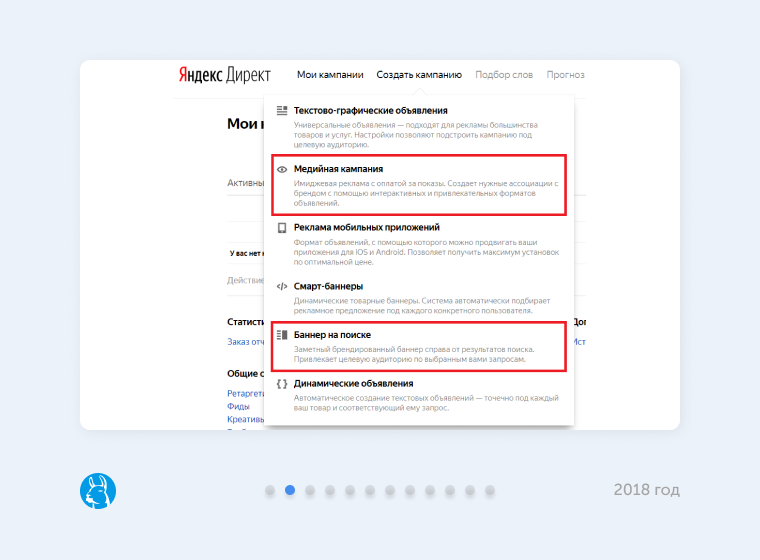 «Перенос медийной рекламы в Директ — одно из ключевых изменений в рекламной системе за 2018 год. Прежде кампании этого типа можно было запустить через сервисы Яндекс.Баян и Яндекс.Дисплей. Появление медийной рекламы в интерфейсе Директа значительно упростило управление кампаниями и процесс оплаты.