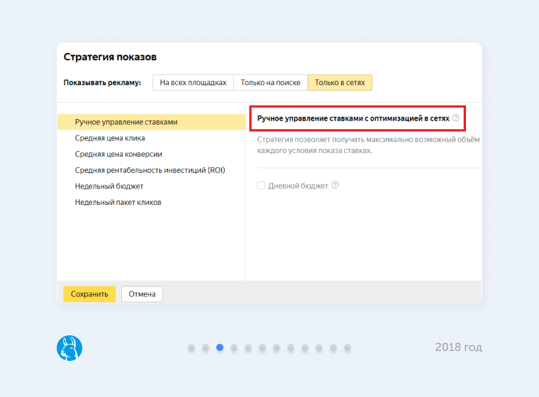 Яндекс заменил прежнюю стратегию в РСЯ «Ручное управление» на «Ручное управление с оптимизацией в сетях». Обновленная стратегия дает возможность максимизировать количество конверсий в рамках заданного бюджета. Система будет с учетом ставок по каждой фразе автоматически снижать ставки для кликов с низкой вероятностью конверсии и повышать для кликов с высокой.