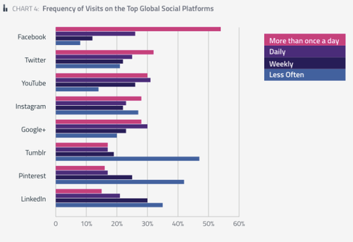 В то время как Tumblr и Pinterest увидели наибольший рост количества новых пользователей, частота использования сетей достаточно низкая.