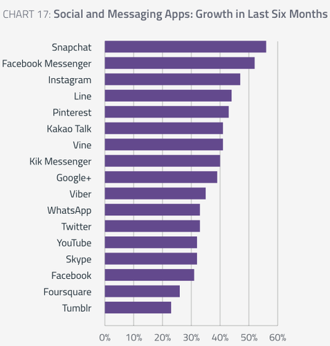 В то время как Facebook является крупнейшим мобильным приложением, приложение Snapchat - с акцентом на подростков и пользователей чуть старше 20 лет - стало самым быстрорастущим в этом году - до 56%. Однако Facebook Messenger и Instagram следуют за ним по пятам - это знак того, что мобильные приложения Facebook по-прежнему являются драйверами роста компании, а также способом привлечь больше пользователей к автономным приложениям.