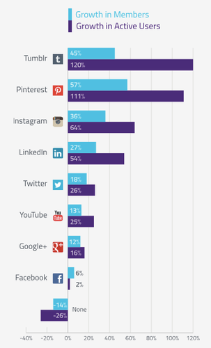 Больше всего выросло количество пользователей сети Pinterest – на 57%, в то время как аналогичный показатель Facebook вырос всего на 6%. Instagram, LinkedIn, Twitter, YouTube и даже Google+ - все росли быстрее, чем Facebook.