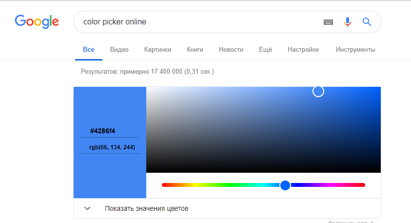 Этот инструмент выводится по запросу [color picker online]. С его помощью можно подбирать цвета.