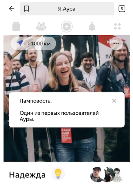 Разработчики новой социальной сети Яндекса Ауры отметили всех пользователей, участвующих в тестировании, специальной ачивкой в виде горящей лампочки.