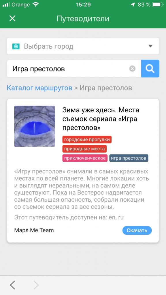 В приложении MAPS.ME появился маршрут по местам съемок сериала «Игра престолов». Он охватывает локации, задействованные в предыдущих семи сезонах. Теперь все поклонники «Игры престолов» могут совершить увлекательное путешествие по самым знаковым местам телесаги.