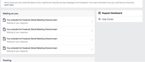 - После обращения пользователь будет получать уведомления в свой профиль на Facebook о том, что запрос был принят и может быть рассмотрен в панели поддержки.