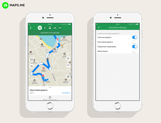 Картографический сервис MAPS.ME добавил возможность построения маршрутов с учетом типов дорог.