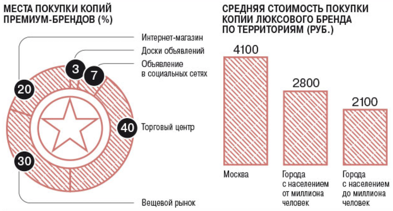 Полученные данные свидетельствуют о том, что чаще всего через интернет покупатели приобретают поддельные футболки, кроссовки, джинсы и сумки. Основными же каналами сбыта, с долями 40% и 30% соответственно, по-прежнему выступают торговые центры и вещевые рынки.