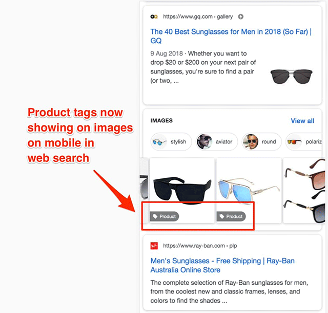 Напомним, что в результатах поиска по картинкам метки для товаров были запущены в 2017 году. Для отображения этих ярлыков на страницы сайта должна быть добавлена соответствующая разметка.
