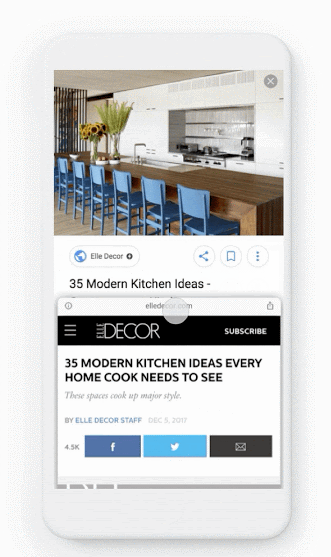Функция Swipe to Visit была анонсирована на конференции Google I/O 2019 в мае. Для создания превью используеся пререндеринг. По свайпу вверх пользователь перейдёт на соответствующую страницу, а издатель получит просмотр страницы.