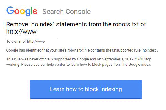«Google обнаружил, что файл robots.txt вашего сайта содержит неподдерживаемое правило “noindex”. Это правило никогда официально не поддерживалось Google, а с 1 сентября 2019 года оно перестанет работать. Посетите наш Справочный центр, чтобы узнать, как блокировать страницы, чтобы они не попадали в индекс Google», - гласит текст оповещения.