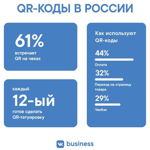 ВКонтакте для бизнеса и ResearchMe в ходе совместного исследования выяснили, что 34% россиян готовы зашифровать свою личную информацию в QR-код для ее активного использования. К такой информации респонденты отнесли номер телефона (49%), ссылки на соцсети (47%) и электронную почту (39%). При этом 37% опрошенных записали бы в него свою группу крови и паспортные данные. А каждый 12-й не только готов закодировать личную информацию, но и сделать татуировку с уникальным шифром.
