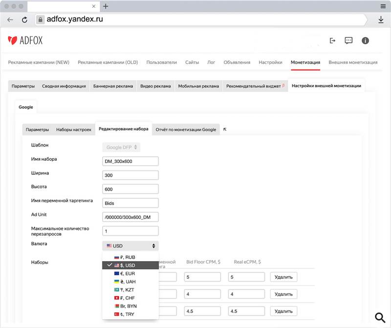 Для более удобного управления показами от разных рекламных систем в Динамической монетизации появилась возможность выставлять CPM-пороги в разных валютах. Кроме рублей, теперь можно выбрать доллар, евро и другие валюты из списка в интерфейсе.