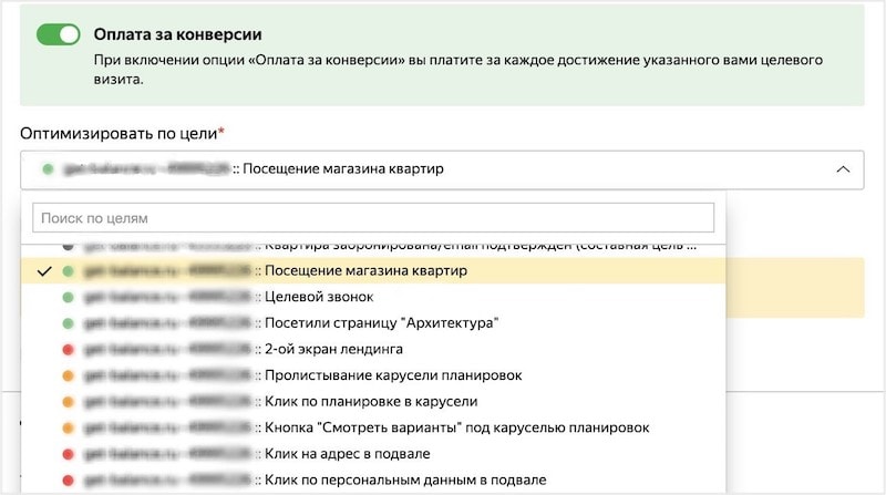 Рекламодатель выбирает цель для автостратегии «Оптимизация конверсий», указывает желаемую цену конверсии и платит за те целевые визиты, которые случились в течение 21 дня с момента клика по рекламе.