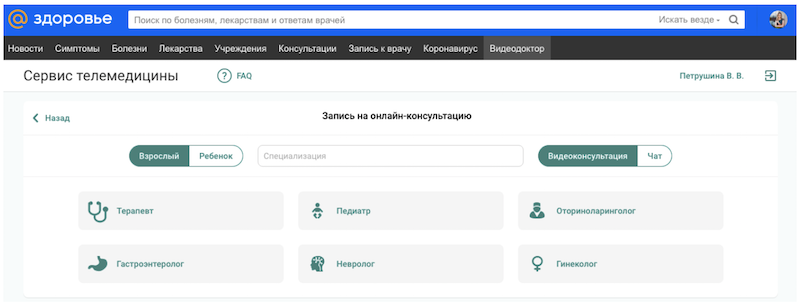 В новом сервисе пользователь сможет выбирать врача и его категорию из шести самых востребованных специальностей: терапевт, гастроэнтеролог, невролог, оториноларинголог, гинеколог, педиатр. Выбор клиник пока небольшой — 3 частных учреждения. В ближайшее время их количество будет увеличиваться.
