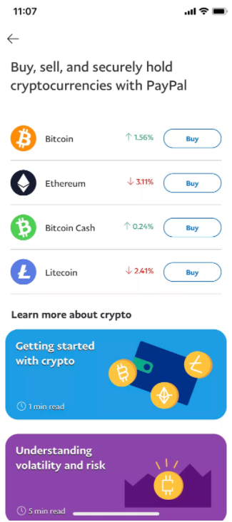 В приложении PayPal появился баннер с информацией о том, что теперь в нём разрешены операции с криптовалютой. Среди доступных вариантов значатся Bitcoin, Ethereum, Bitcoin Cash и Litecoin.