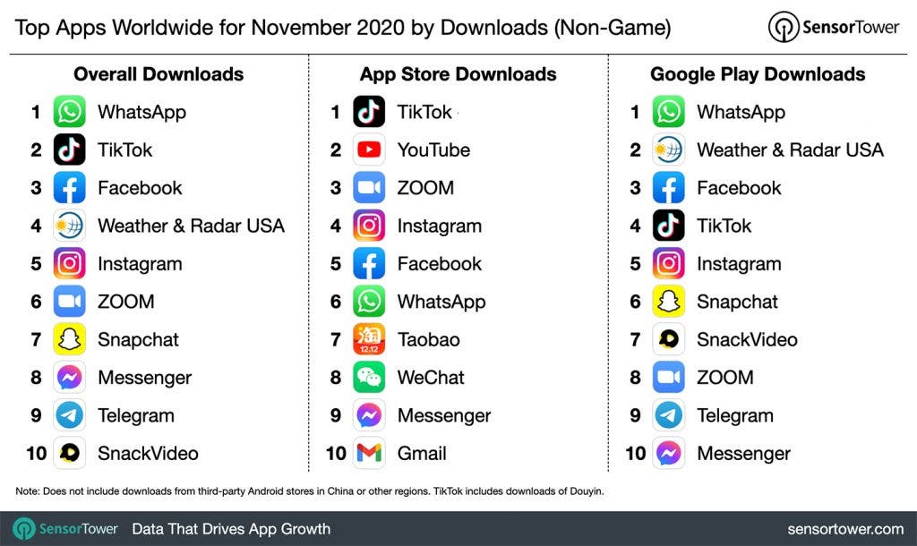 В ноябре самым популярным неигровым приложением с наибольшим доходом стал мессенджер WhatsApp. Согласно данным аналитической компании SensorTower, за месяц приложение WhatsApp было установлено 58 миллионов раз.