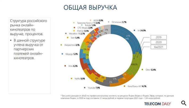Распределение выручки между игроками за полгода существенно не изменилось. По данным аналитиков, доля ivi выросла с 23% до 24%, вторым стал КиноПоиск HD – с 8% до 14,1%, третьим Okko — он сократил долю с 15% по итогам 2020-го до 12,4%.