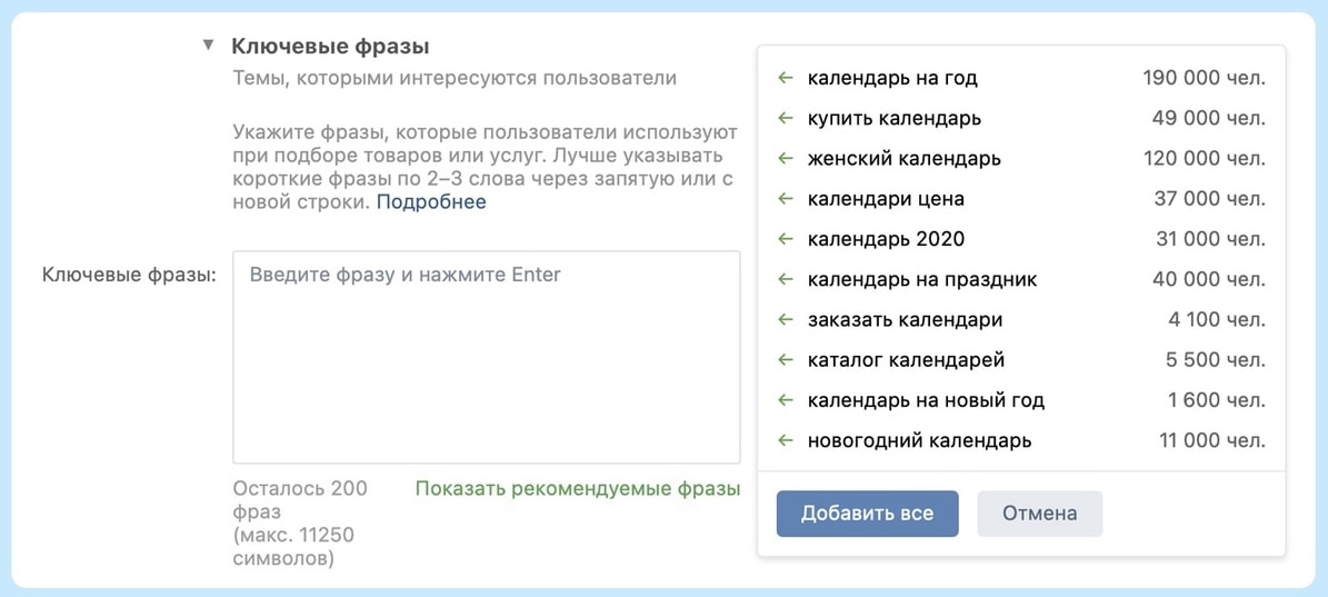 Тем кому не не хватает времени или опыта, больше не придется выдумывать или искать запросы. Достаточно просто перейти в блок «Настройки целевой аудитории» → «Ключевые фразы», нажать «Показать рекомендуемые фразы» — и стартовый список готов.