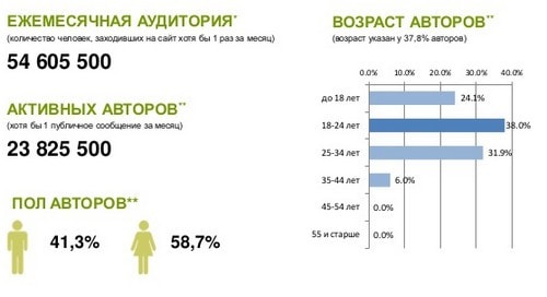 Ежемесячная аудитория ВКонтакте в декабре 2014 года составила 54,6 млн пользователей, из которых почти 24 млн – активные авторы. 58,7% активных авторов ВКонтакте составляют женщины. В разрезе возрастной структуры авторов преобладает молодежь от 18 до 24 лет — 38% авторов.