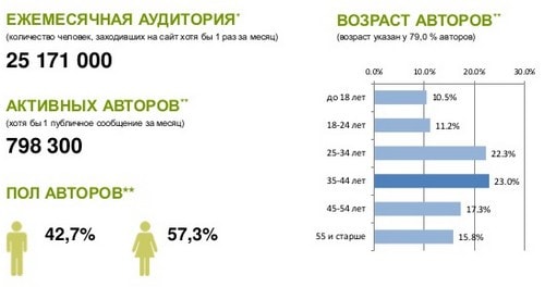 Декабрьская аудитория сети немного уменьшилась и составила 25,1 млн. пользователей, из которых публичную активность проявили лишь 798 3000 российских авторов (против 2,3 млн в мае 2014 г). Здесь также преобладает женская аудитория (доля женщин в общем числе активных авторов составляет 57,3%). В разрезе возрастной структуры Мой Мир отличается наиболее равномерным распределением. С небольшим преимуществом лидируют категории от 25 до 34 лет и от 35 до 44 лет (22% и 23% пользователей).