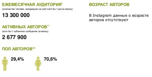 Ежемесячная аудитория фотошерингового сервиса Instagram в декабре 2014 года составила 13,3 млн пользователей, из которых почти 2,7 млн – активные авторы. 70,6% активных авторов этой социальной сети составляют женщины.