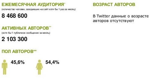 Аудитория сервиса микроблоггинга Twitter в декабре 2014 г. составила 8,4 млн пользователей, активных авторов из них – 2,1 млн. человек. Среди активной аудитории этой социальной сети так же преобладают авторы женского пола — 54,4%.